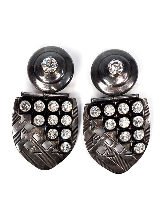 Gunmetal Oversized Shield Glass Rhinestone Earrings