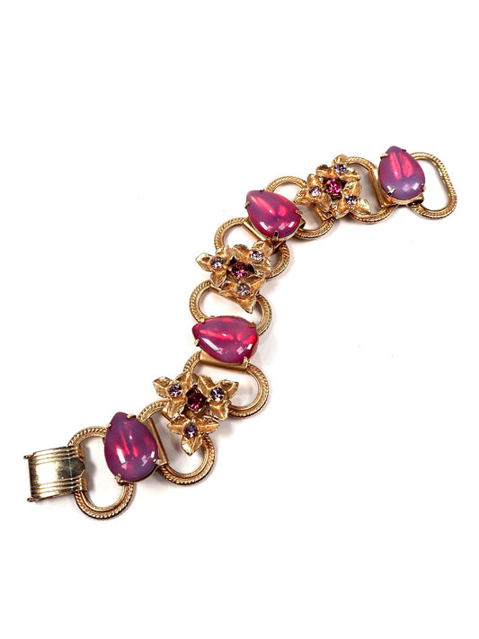 Pink Ruby Glass Stone Gold Floral Motif Bracelet