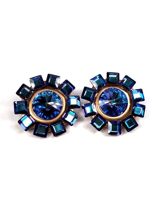 French Oversized Round Blue and Gold Glass Jeweled Earrings