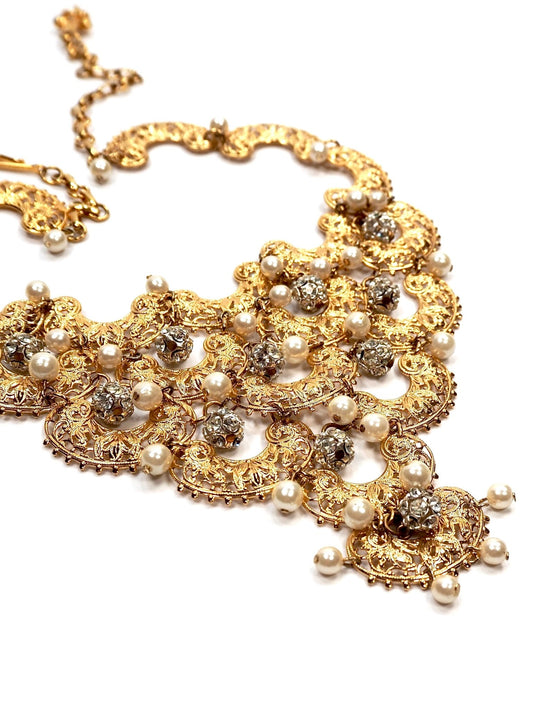 Vendome Gold and Faux Pearl Filigree Bib Statement Necklace