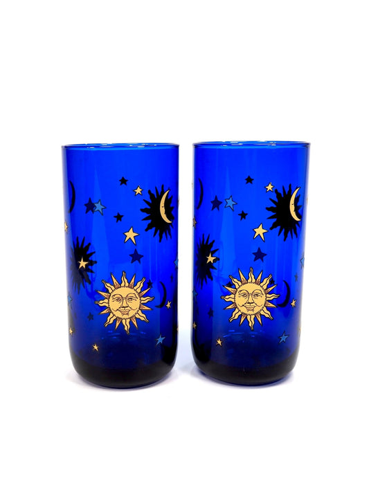 Libbey Cobalt Blue Celestial Sun Moon Star Tumbler Glasses