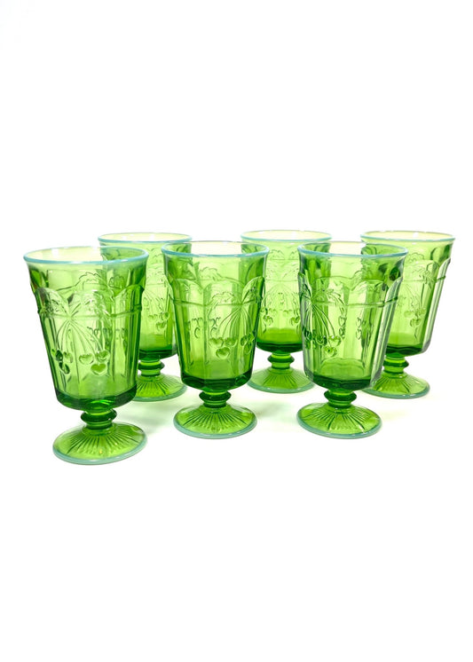 Mosser Green Opalescent Cherry and Cable Stemmed Drinking Glasses Set of 6